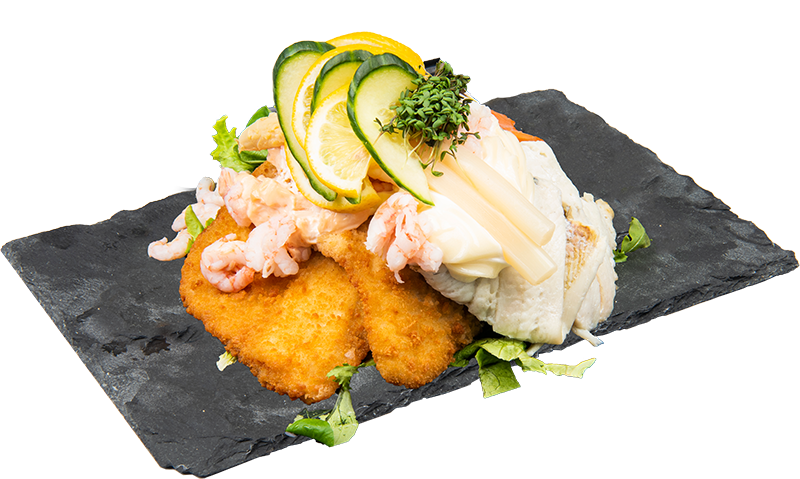 2 stegte og 1 dampet fisk, rejer, asparges, laks og dressing